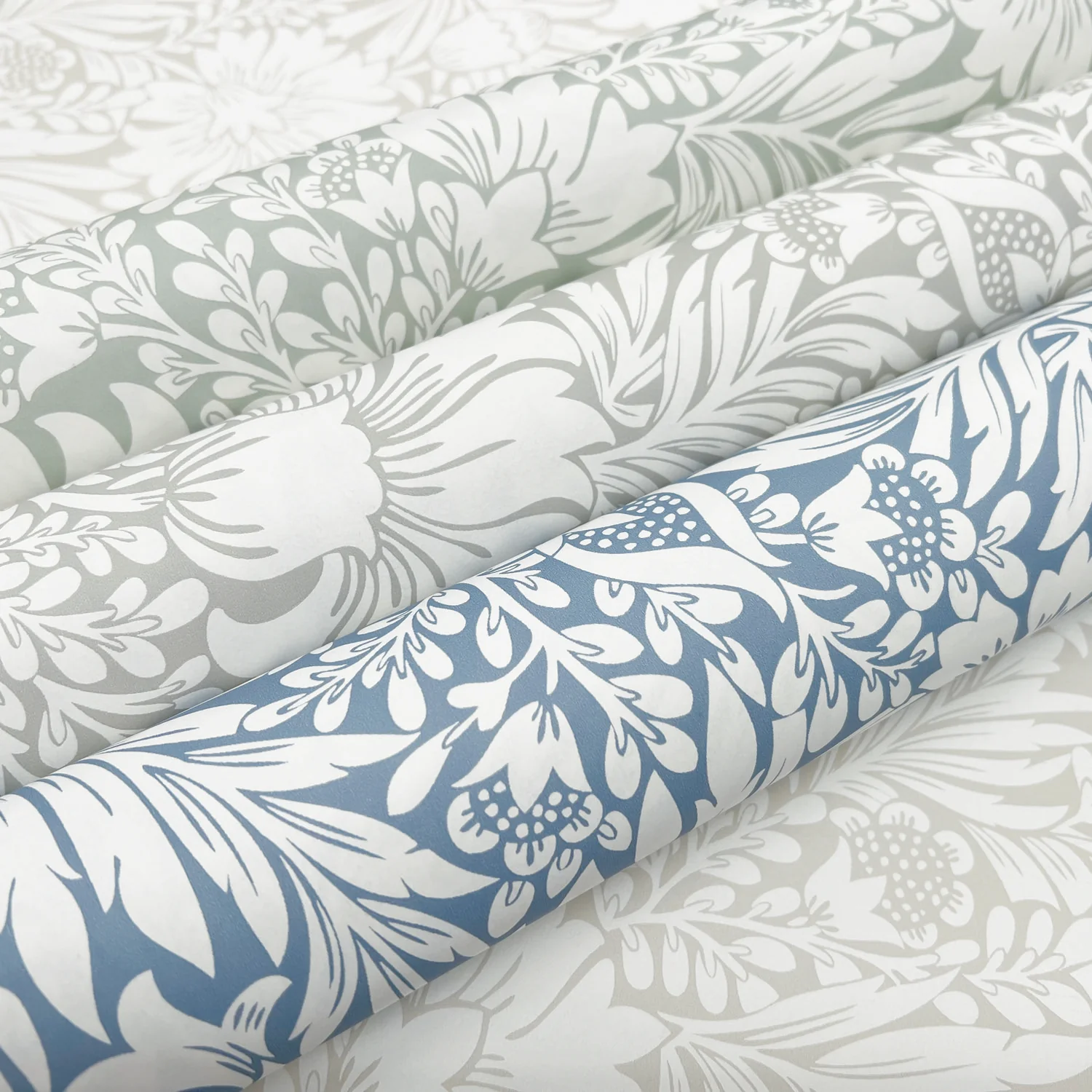 A dense allover Modern Acanthus places their iconic leaves intertwined between garden blossoms and stems for a sense of casual classicism.
