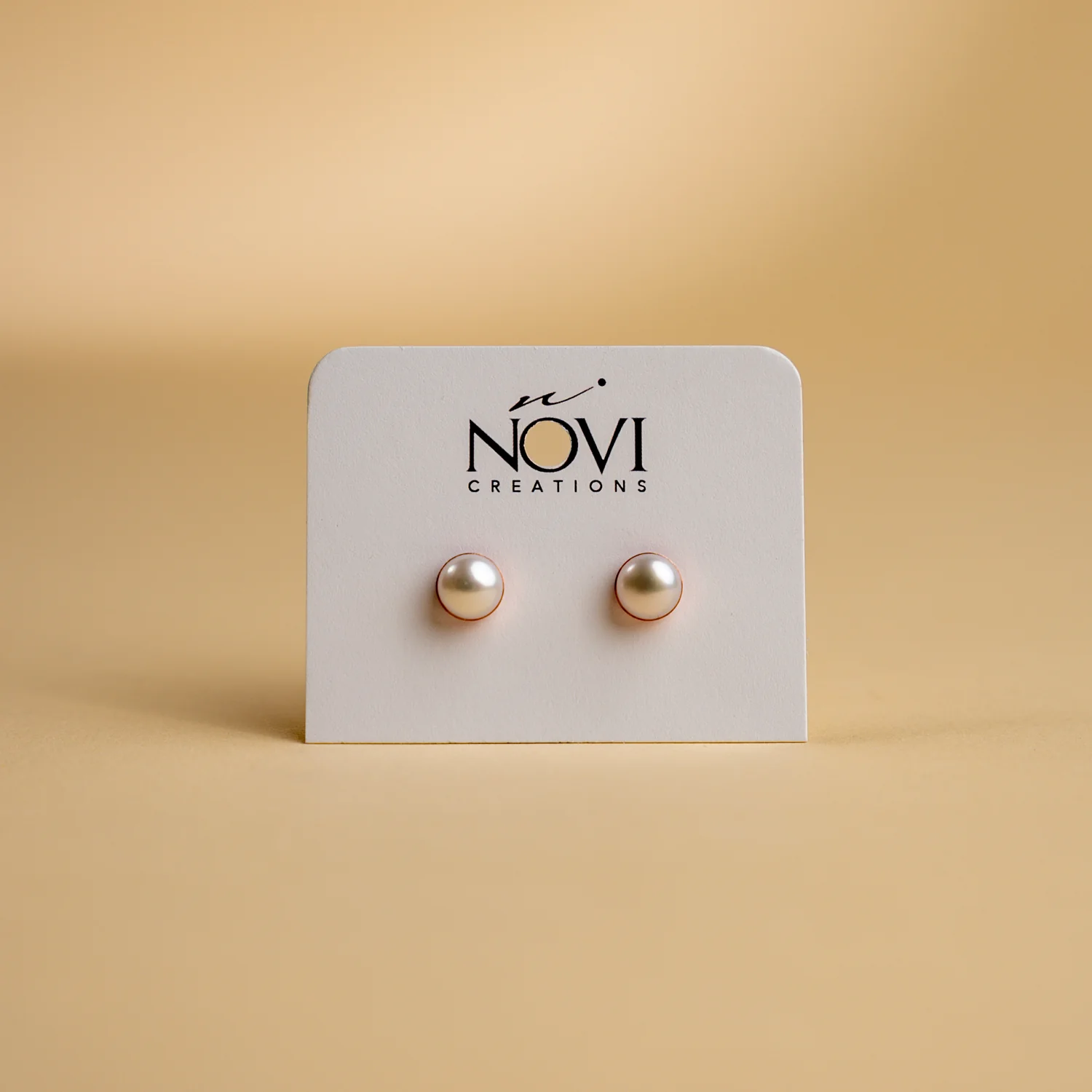 Dainty, round freshwater pearl studs set in a pure copper bezel with sterling silver posts.