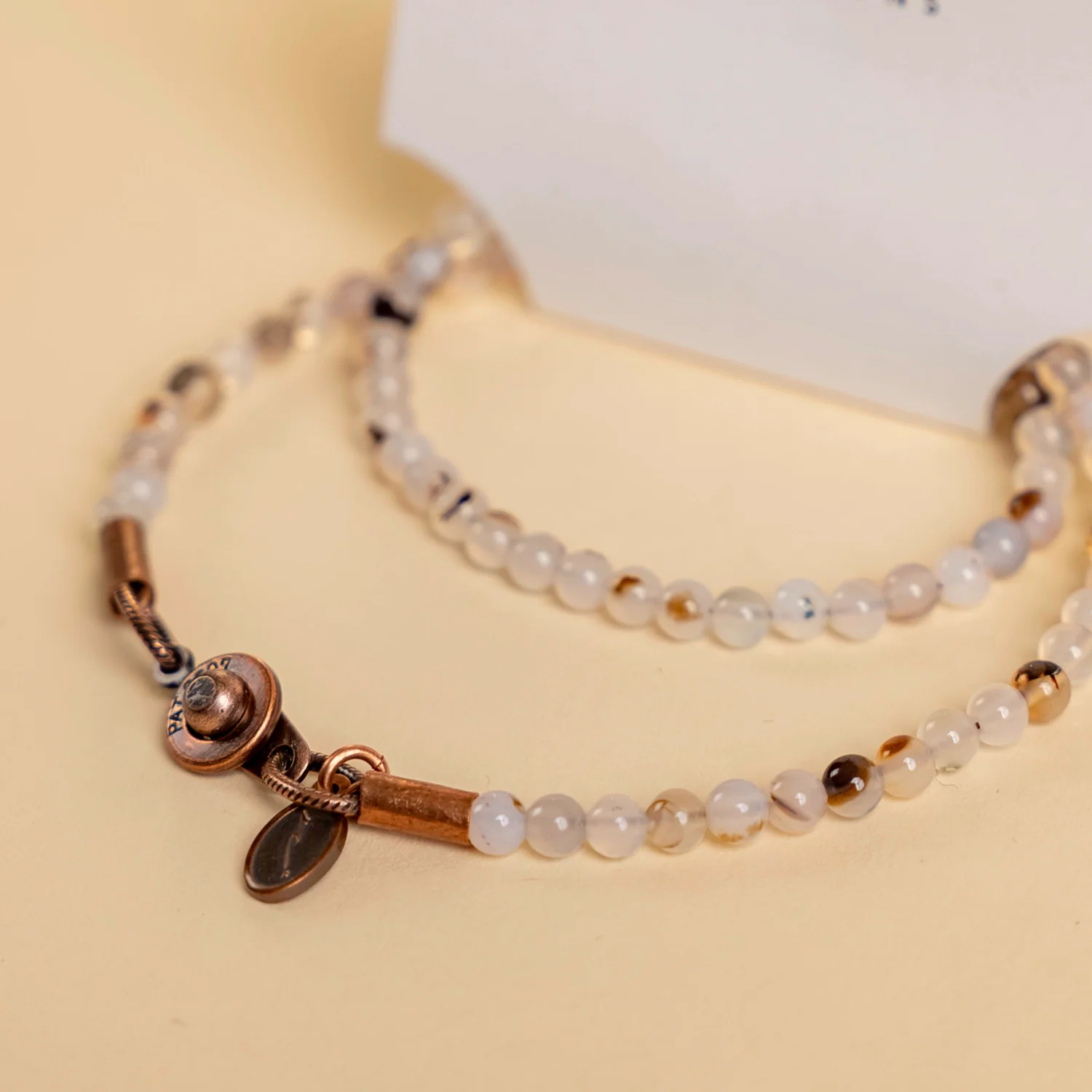 Hand strung on a 49 steel strand coated wire, this 4mm Montana Agate strand can be worn as a double wrap bracelet or a short choker style necklace-it is like two pieces of jewelry in one! These come 14” in length, but you can purchase an extender to create longer length styles! All handmade from start to finish.