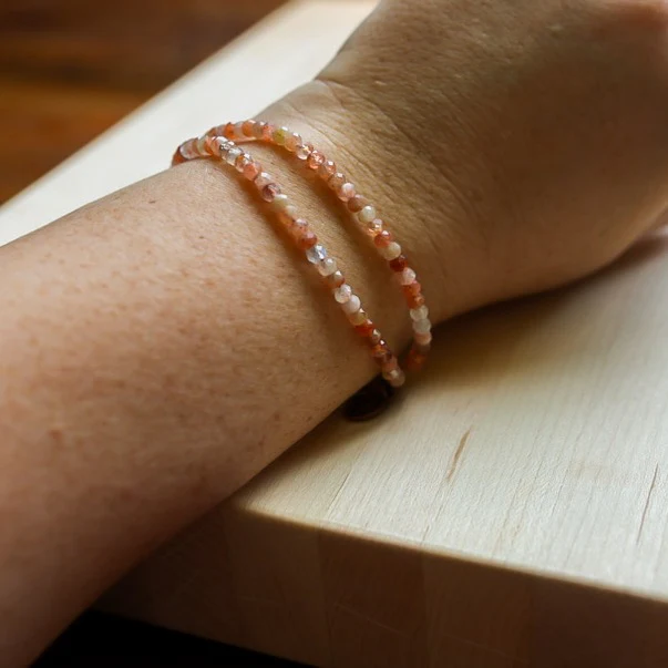 Hand strung on a 49 steel strand coated wire, this 4mm peach moonstone strand can be worn as a double wrap bracelet or a short choker style necklace -it is like two pieces of jewelry in one! These come 14” in length, but you can purchase an extender to create longer length styles! All handmade from start to finish.