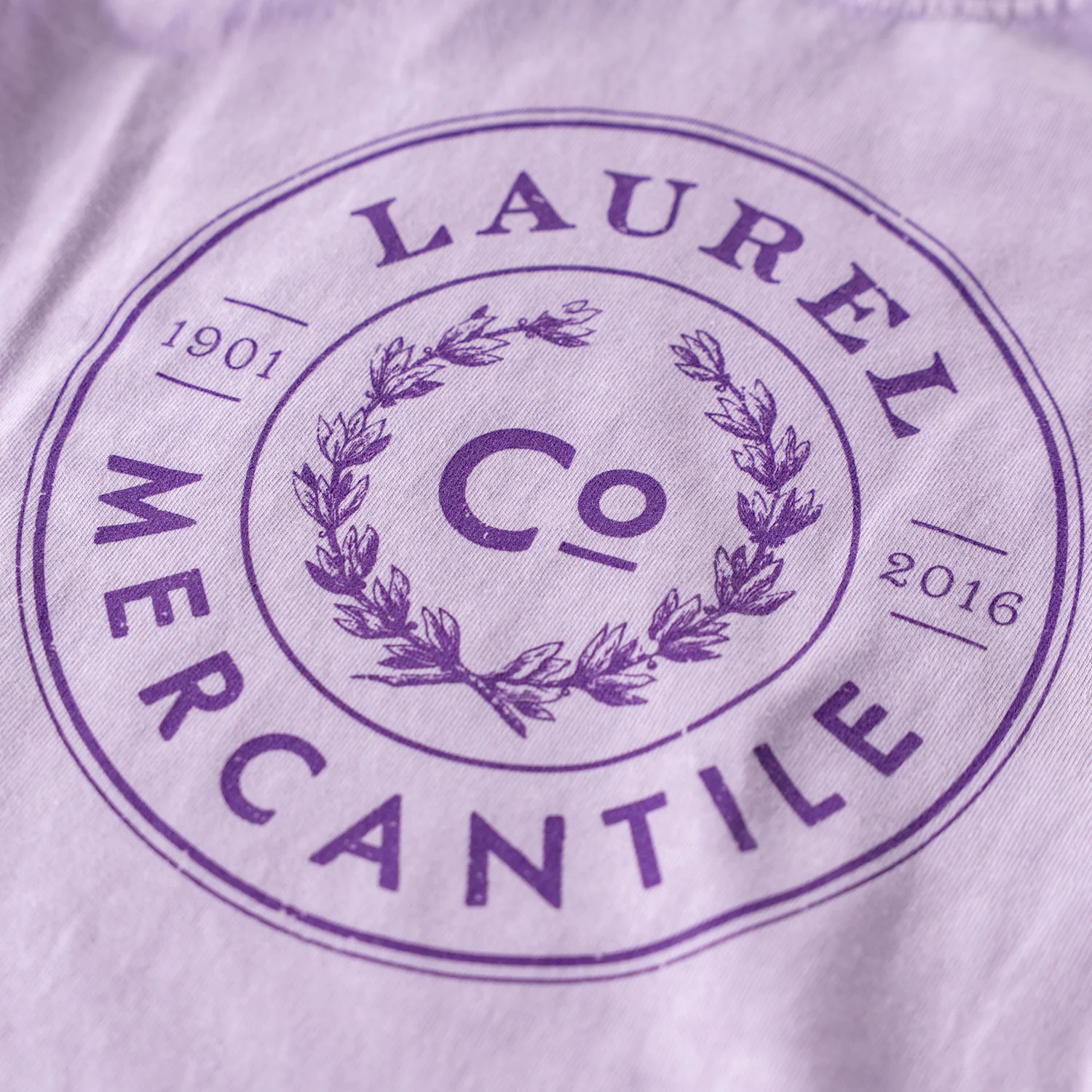 Our best selling design now in youth sizes! A soft, pigment dyed tee with the Laurel mercantile Co. wreath logo printed large on the chest in purple ink.