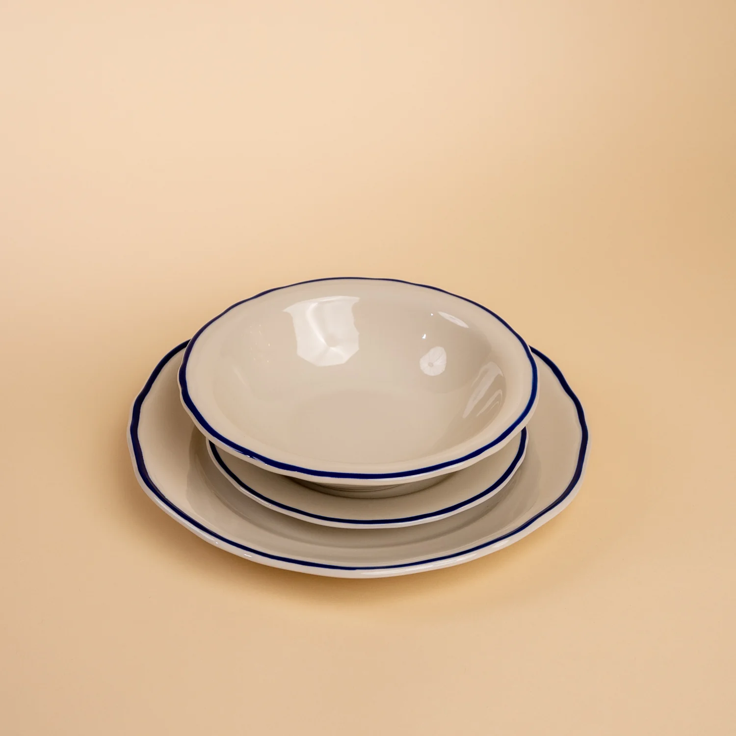 As seen on Home Town's episode featuring the Napiers' personal dish cupboard. If classic and timeless describe your style, then you will love our Carolyn collection...it's obviously a favorite of ours! Carolyn's feminine scalloped ivory shape is outlined in a simple, solid hand-painted blue or black band. The blue pairs beautifully with the Blue Star and Marisol or vintage blue willow pieces. Made in the U.S.A. by the same company that's been bringing these classic, quality pieces to diners and homes for over 150 years!
