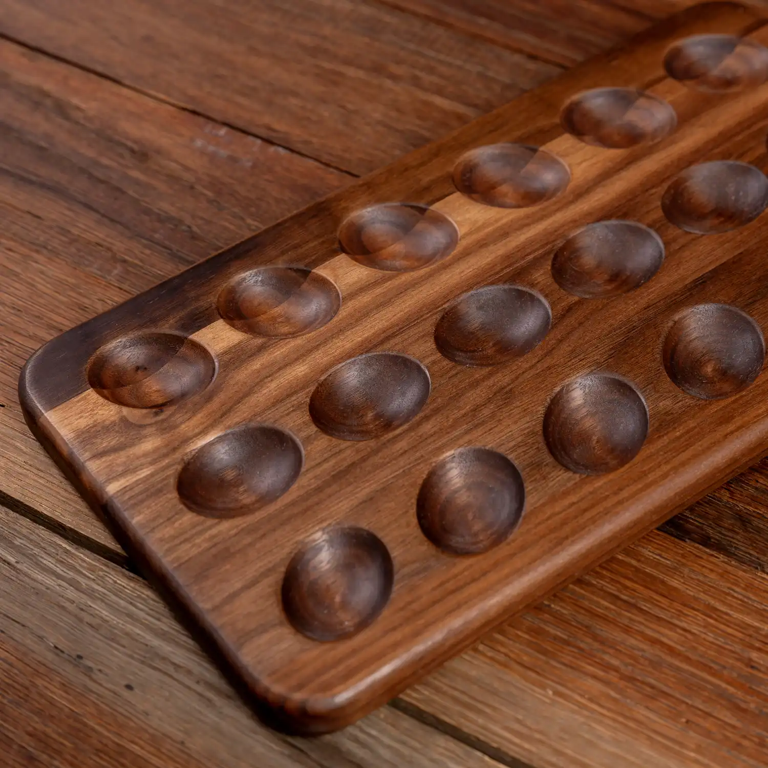 Impress your guests with this Walnut Deviled Egg Tray, perfect for any party. Designed to hold 18 eggs, ideal for gourmet deviled egg tray and other appetizers. The tray can also be used as a serving plate by simply turning it upside down. Great multifunctional piece for any kitchen.